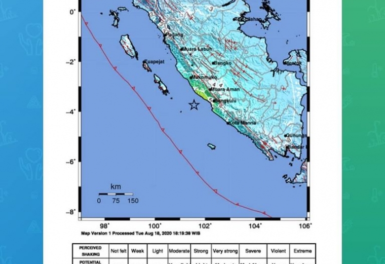Bekngkulu, Siber-news.com - Gempa bumi berkekuatan 6,9 magnitudo menguncang Kota Bengkulu dan sekitarnya pada Rabu (19/8/2020) pagi sekira pukul 05.23 WIB. Pusat gempa bumi berada di laut 169 km barat daya Bengkulu. Mengutip data dari Badan Meteorologi, Klimatologi dan Geofisika di laman resminya bmkg.go.id, gempa ini terasa juga hingga di Kabupaten Kepahiang, Liwa dan Kota Bumi.